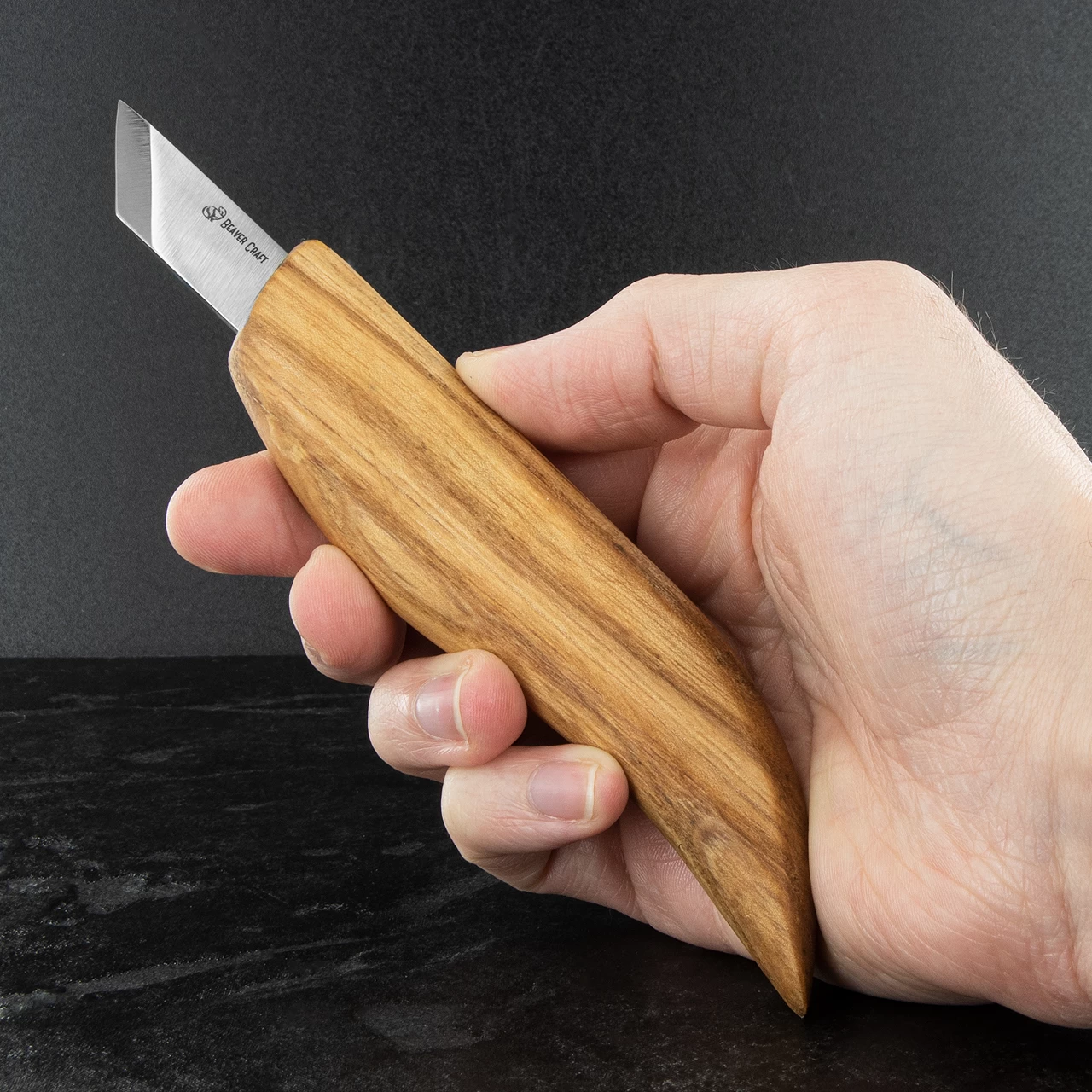 The Beavercraft Chip Carving Set consists of two knives (one straight edge and one bevelled), a leather strop and a block of strop paste for keeping your edges nice and keen.