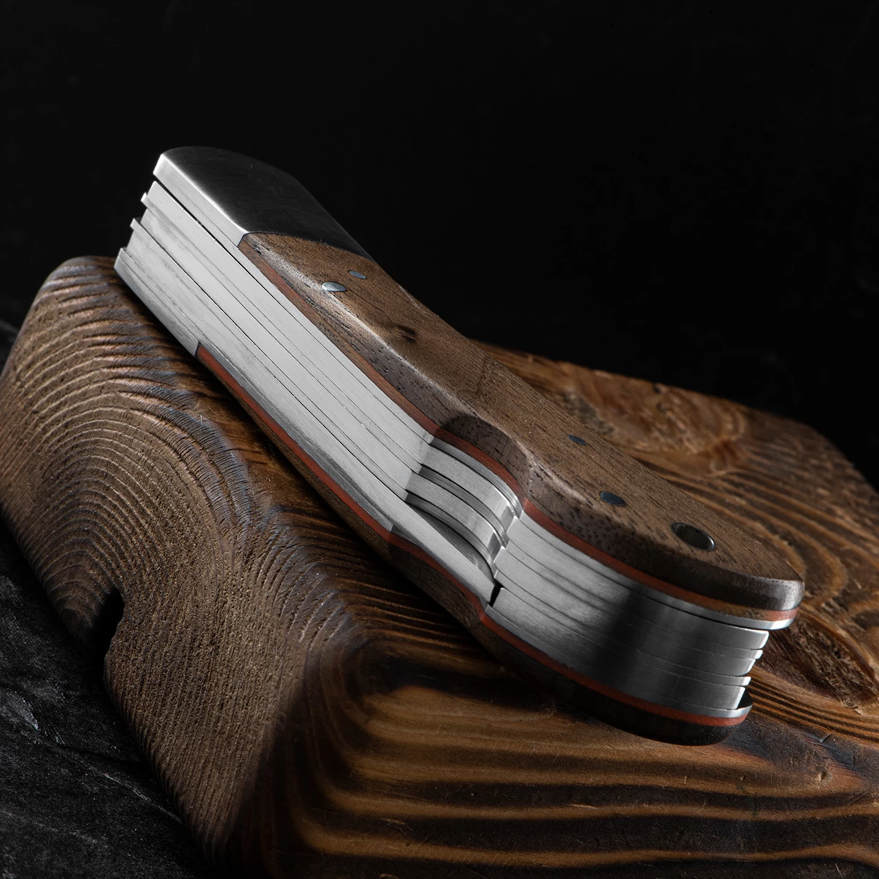 Made in Italy this knife is a quality item made with the uppermost care and attention. This is exemplified by the handle. It is made from Walnut wood with an orange G10 lining. Great to look at and incredibly strong.