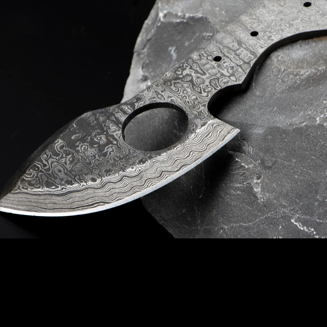 If you’ve ever fancied making your own knife then now is your chance. This blank has a uniqely shaped blade with a large hole cut out. With a bit of imagination with your handle choice you could own a knife of real distinction. The blade material is layered Damascus with a full tang and four pin holes.