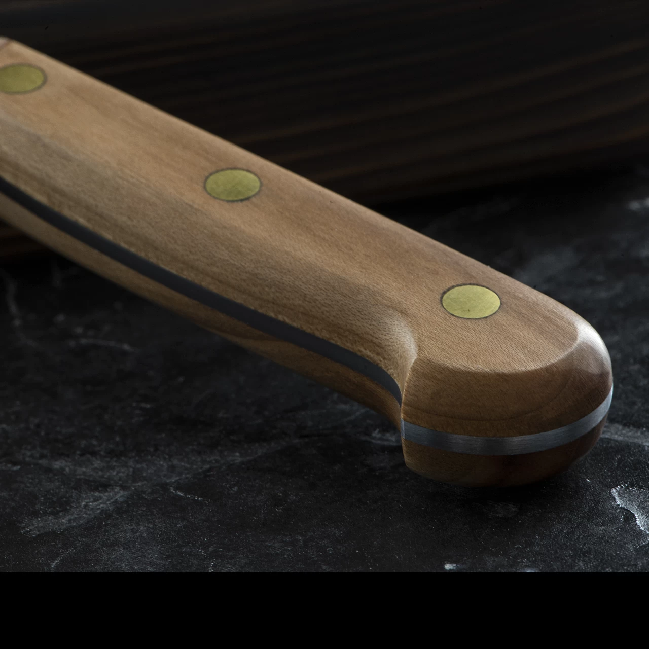 Since the 14th century, the Kotten farm cottages have shaped the history of the German city of Solingen, the city of blades. The massive grinding stones were driven by pure water power and the world-famous blades were sharpened by hand. The Boker Cottage-Craft chef’s knife series continues the heritage of this traditional craftsmanship with a carefully chosen choice of classic materials.