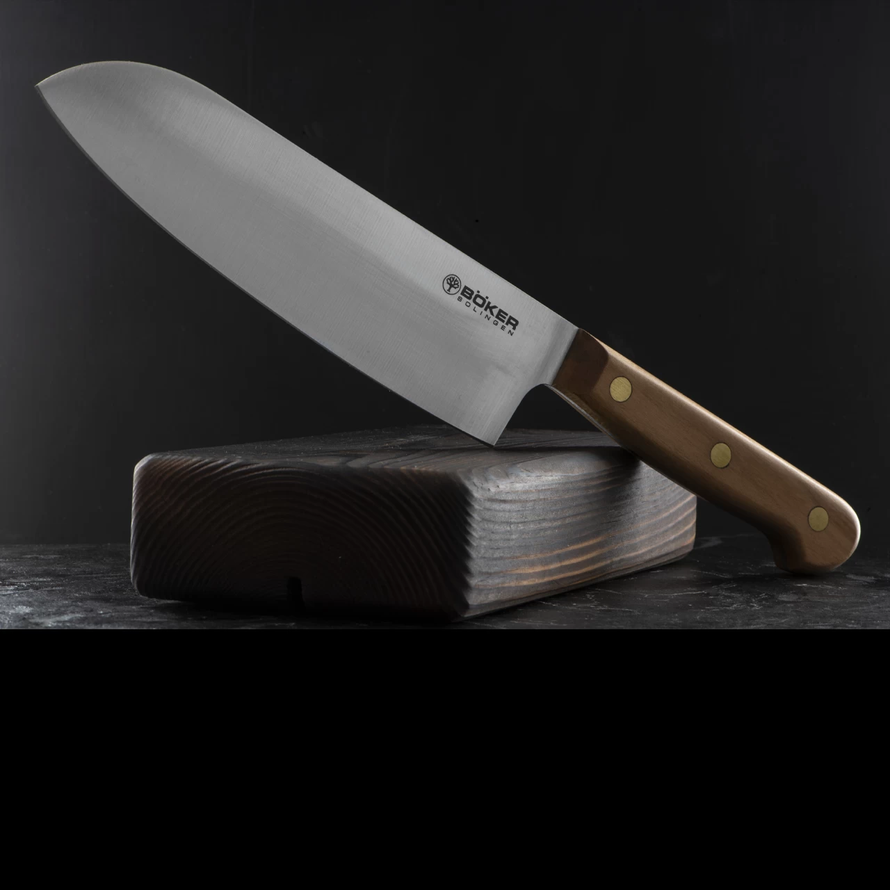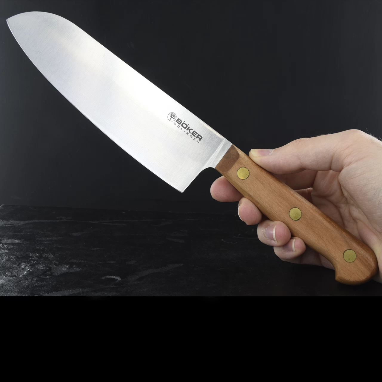 A knife that is also becoming increasingly popular in Europe is the Santoku. It is originally a Japanese blade shape for an all-purpose knife. Translated its name means “The three virtues”. The Boker Cottage-Craft Santoku it is equally suitable for meat, fish and vegetables. The wide blade makes the Santoku particularly easy to handle.