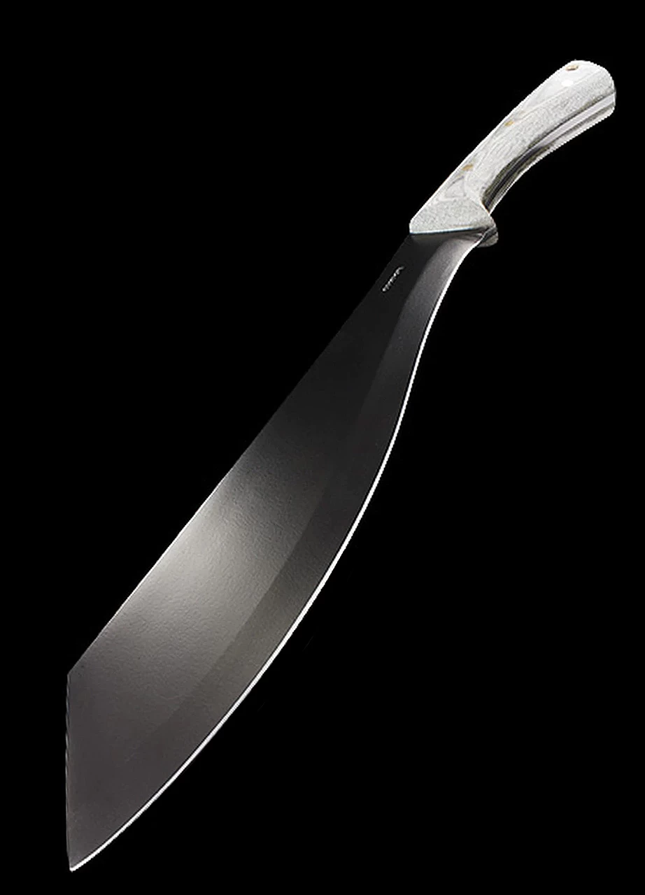The Condor Warlock is full tang 1075 High Carbon Steel with Epoxy Black Powder Coating. Finished with a grey Micarta handle and black leather sheath with swivel belt loop.