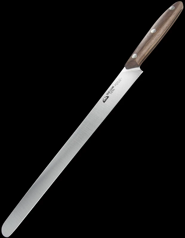 The Due Cigni 1896 Kitchen knife is proudly made in Italy, a stamp of quality in both design and manufacture. The Ham Knife has a nice flat blade edge and flat grind, perfectly suited to slicing a ham joint. It is available with a 24 or 26cm blade.