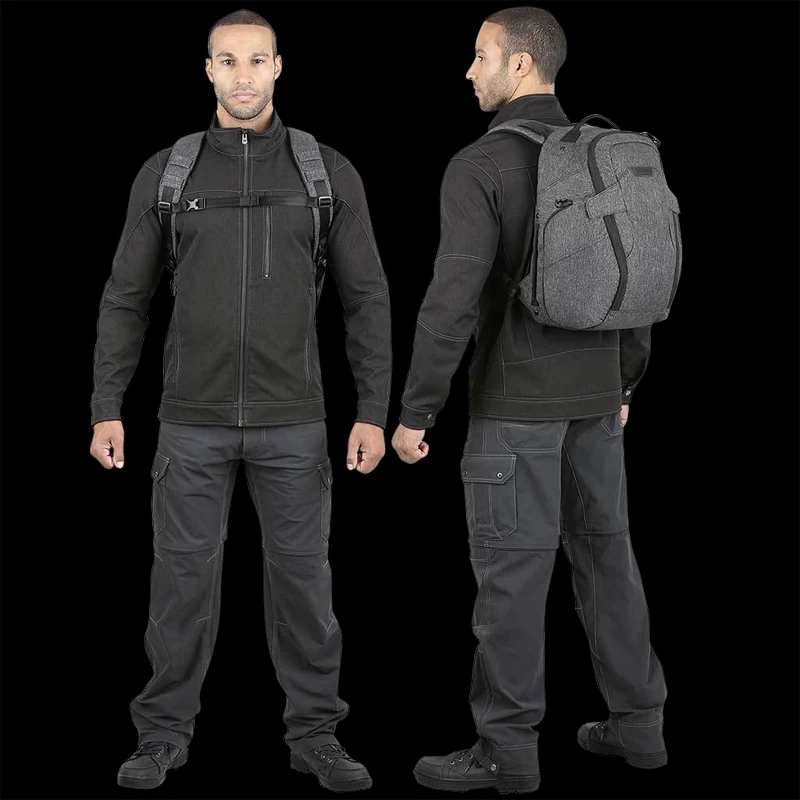 The Maxpedition Entity 21 is an ergonomic everyday carry pack with padded shoulder straps and quick release buckles. The main compartment has drawbridge straps for additional security, and there is a dedicated sleeve sized to fit most tablets. The front exterior has tuckable magnetic wings for quick temporary closing of the main compartment. The dual access rear compartment is fully loop-lined, and a double-sided hook Security Lockout Strip is included. Dual side ports are perfect for headphones, charger cables, etc.