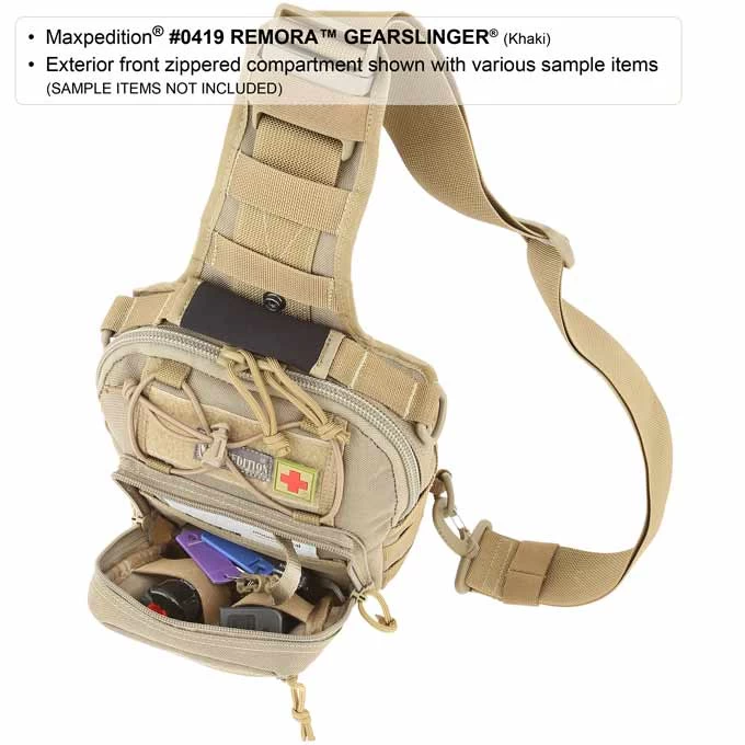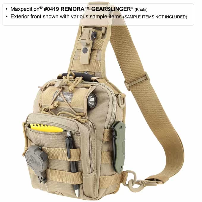 Maxpedition Remora Gearslinger. A low-profile everyday carry pack loaded with features and attachment points; the Remora is a purposefully designed bag with CCW compatibility bag. Pack your standard photo gear, some extra clothes or a general-purpose first aid kit. An additional front pocket and pouch are perfect for storing your wallet, phone, keys, binoculars, admin kit and/or hand-wipes. Carry it by its padded grab handle or concealable shoulder strap. The Remora is fantastic for mountain biking, running or everyday urban use.