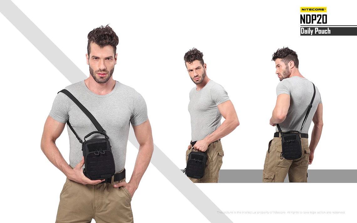 The NDP20 can be carried using the reinforced grip for handheld use, attaching the adjustable shoulder strap, or with the detachable nylon joinings on the back of the pouch if attaching to a belt or another bag.