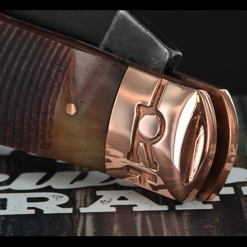 The bone scales are copper-pinned to the body of the knife, with shiny copper coloured bolsters setting the knife off to great effect.