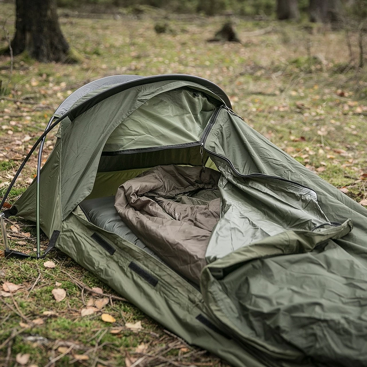 The Snugpak® Stratosphere is an easily pitched, classic bivvi shelter with a self-supporting canopy around the head and shoulders, which allows increased breathability and movement while giving protection from the elements.
